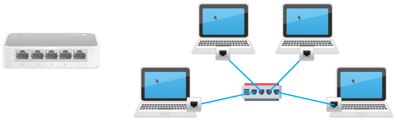 - 대역폭이 100mbps인 회선으로 허브에 5대 PC를 연결하면 PC당 20mbps 대역폭만 사용