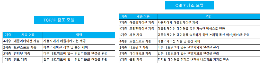 - 대표적인 2가지 계층: TCP/IP 참조 모델, OSI 참조 모델
