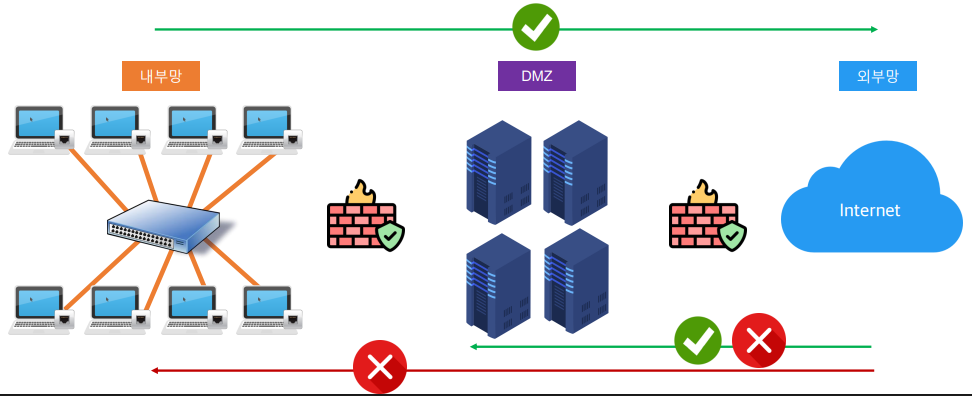 - DMZ 앞뒤로 방화벽이 설치됨(내부망/외부망)