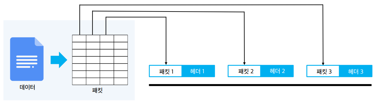 - 패킷 교환 방식(Packet Exchange Method): 데이터를 패킷이라는 작은 단위로 나누고, 헤더라는 정보를 붙여 데이터를 교환하는 방식