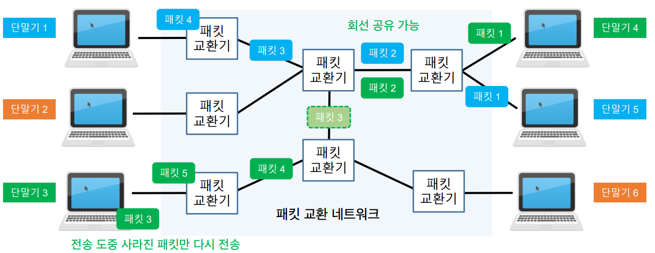 - 패킷 교환 방식(Packet Exchange Method): 필요한 만큼만 회선을 이용하며 같은 회선을 다른 사용자도 함께 사용할 수 있음, 패킷이 손상될 경우 데이터 전체를 다시 보내지 않고 손상된 패킷만 보내면 됨