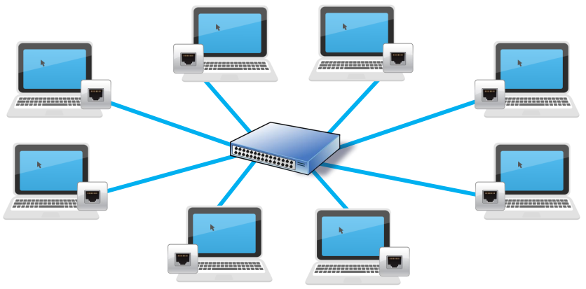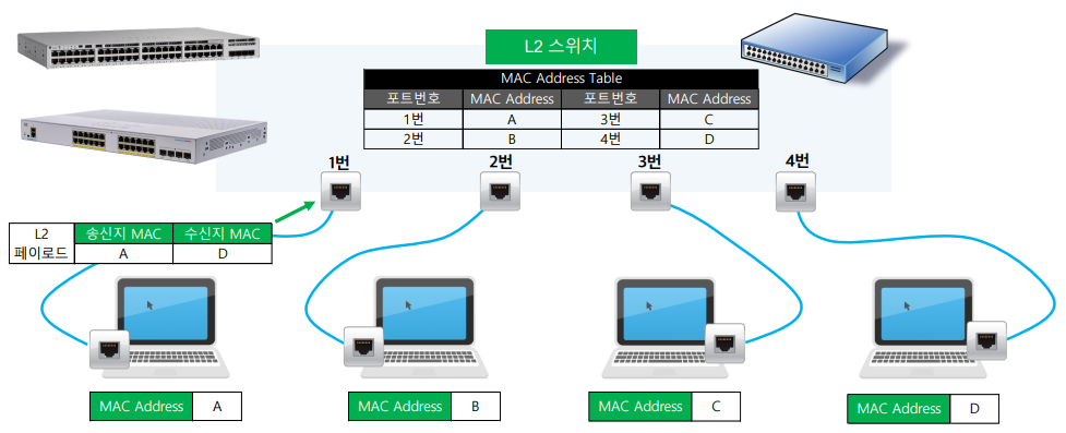 - L2 스위치(Switch): 단말기가 보낸 패킷(프레임)의 헤더에 있는 MAC Address를 보고 같은 네트워크의 다른 단말기로 패킷을 전송, 이더넷(Ethernet) 규격을 사용하기에 이더넷 스위치라고도 부름