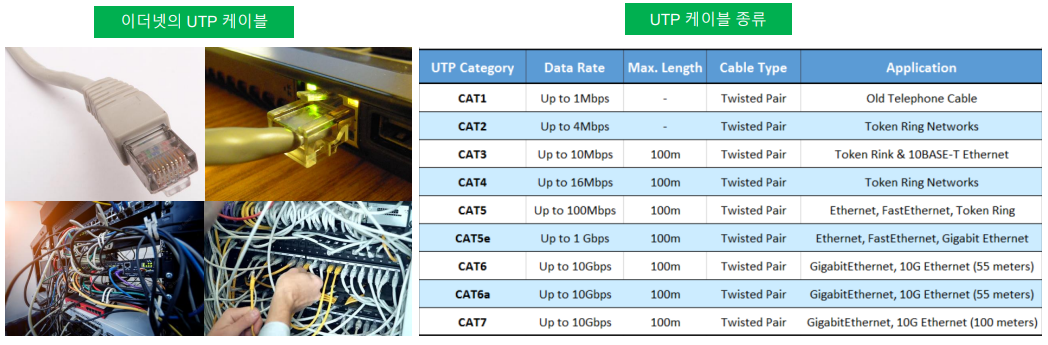 - UTP 케이블의 숫자가 커질수록 전송할 수 있는 데이터량이 많아짐