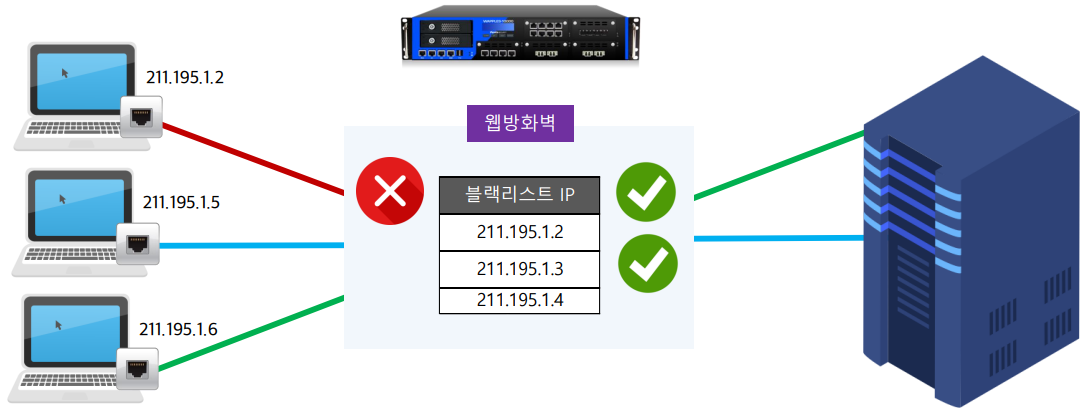 - 블랙리스트: 리스트에 있는 IP는 제외하고 모든 통신 허용