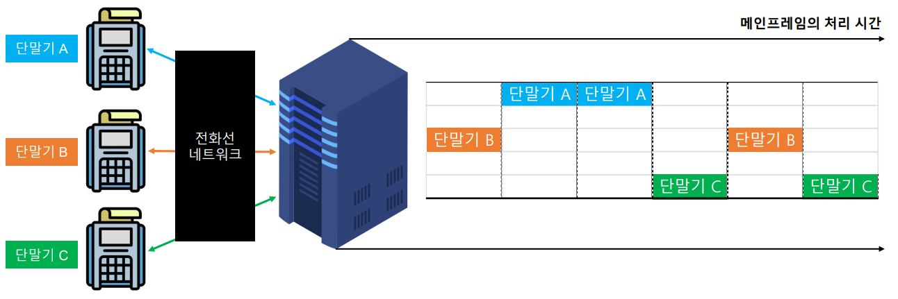 - 메인 프레임의 성능을 단말기들이 나눠서 사용