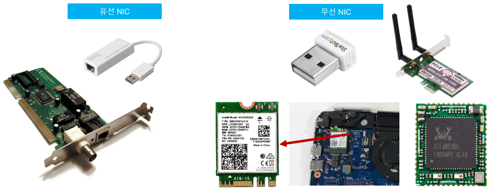 - NIC(Network Interface Card): PC나 서버를 네트워크에 연결해주는 하드웨어 = 랜카드