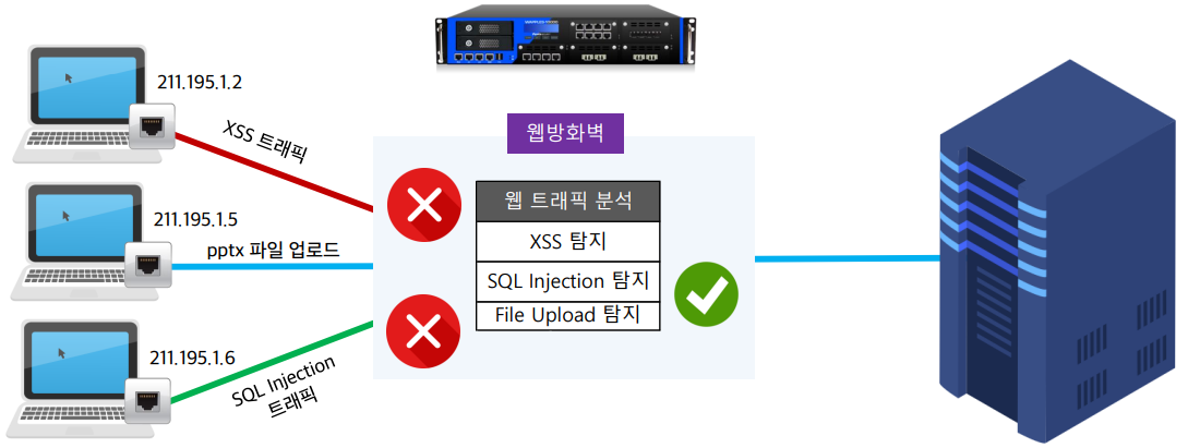 - 웹 방화벽(WAF: Web Application Firewall): 웹 애플리케이션 서버를 안전하게 보호하는 기기