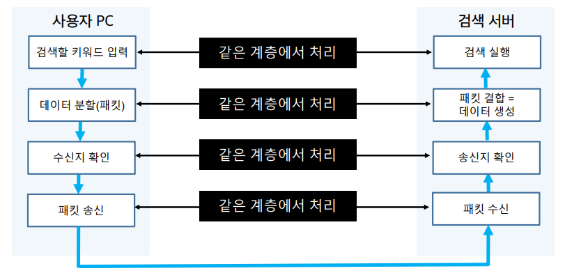 - 계층(Layer): 송신 기기와 수신 기기 사이에서 주고 받는 데이터는 각 계층 별로 처리됨