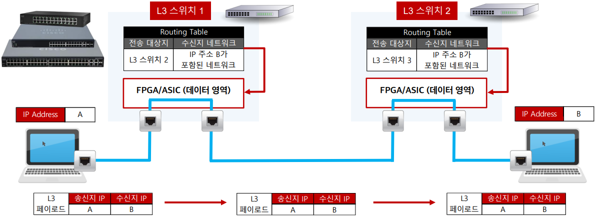 - FPGA/ASIC 과 같은 반도체가 L3 스위치에 있어 데이터 처리 속도가 L2 스위치보다 훨씬 더 빠름, 고성능