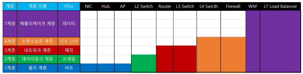 - 각 계층 별로 동작하는 네트워크 기기가 다름