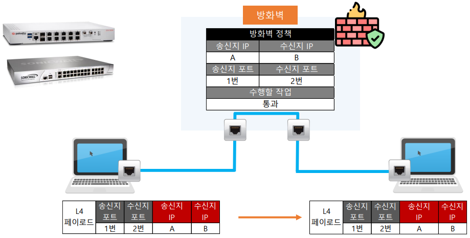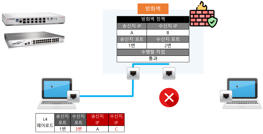 - 방화벽(Firewall): IP주소와 포트 번호를 참조하여 통신을 허가하거나 차단하는 기기