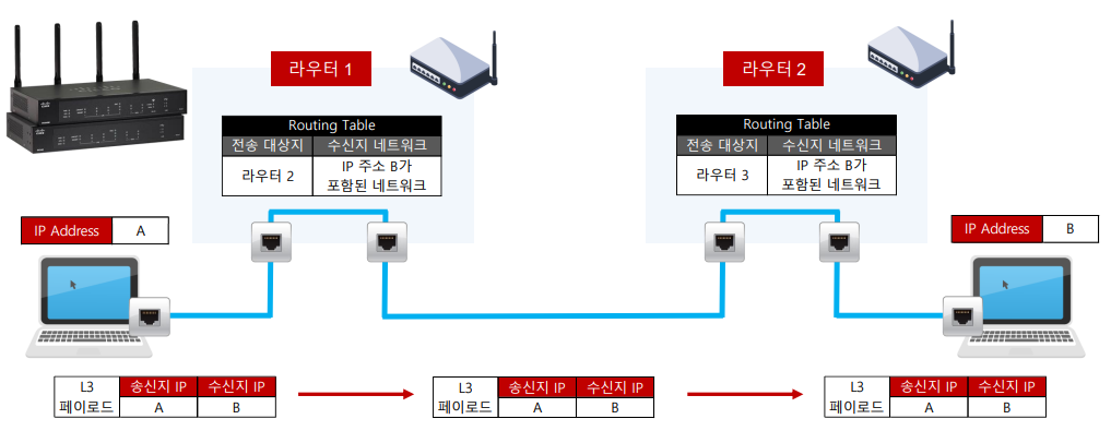 - 라우터(Router): 단말기가 보낸 패킷(IP 패킷)의 헤더에 있는 IP Address를 보고 다른 네트워크의 다른 단말기로 패킷을 전송(라우팅)