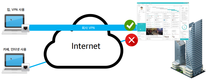 - VPN 사용 예시 #2: 집 혹은 카페와 같은 외부에서 기업 내부의 애플리케이션(사내 그룹웨어)에 안전하게 접속 가능