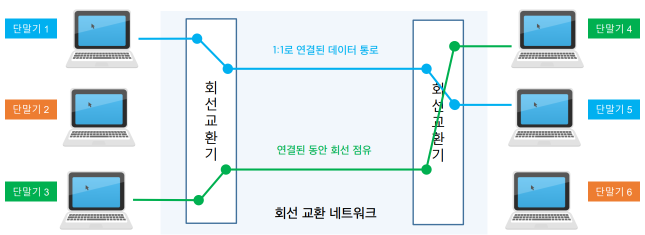 - 회선 교환 방식(Circuit Exchange Method): 데이터를 교환하기 위해 1:1로 연결된 데이터 통로(회선)를 만들고 데이터 교환이 완료될 때까지 회선을 계속 사용하는 방식
