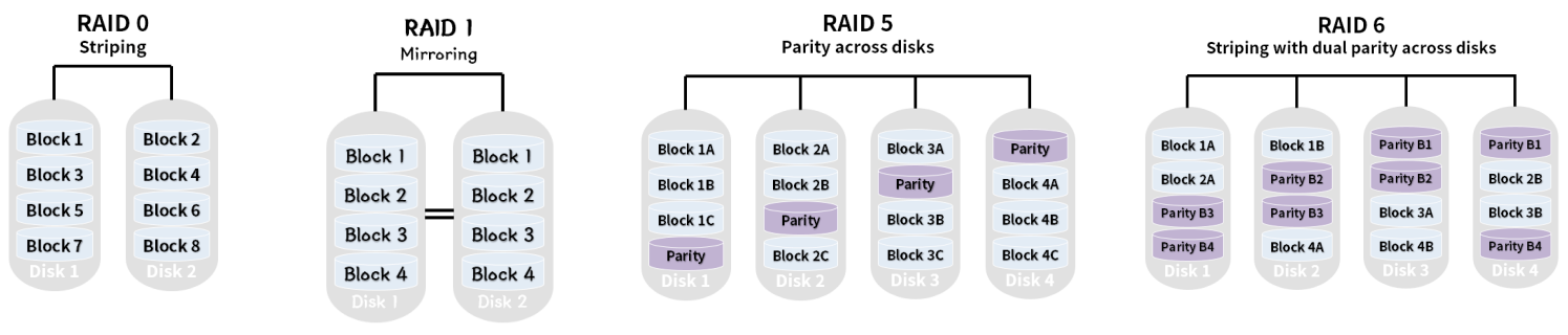 ※ Parity(패리티): 데이터의 무결성과 복구를 위한 오류 검출 및 복구 정보, 디스크 장애 발생 시 데이터 복구할 수 있도록 도와줌