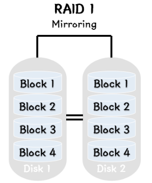 - RAID 1: 데이터를 다른 디스크에 동일하게 중복 저장하여 안정성이 높지만 비용이 많이 듬
