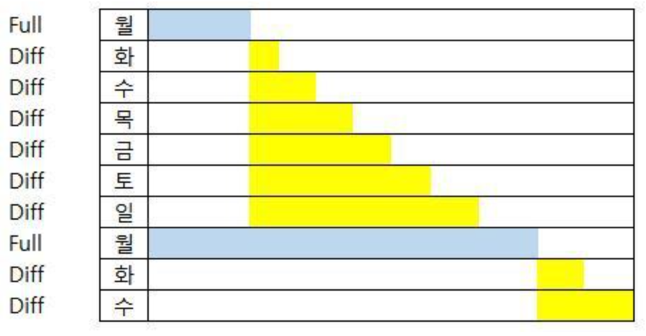 - 차등 백업(Differential Backup): 마지막 전체 백업 이후에 추가/변경된 데이터를 모두 포함하여 백업