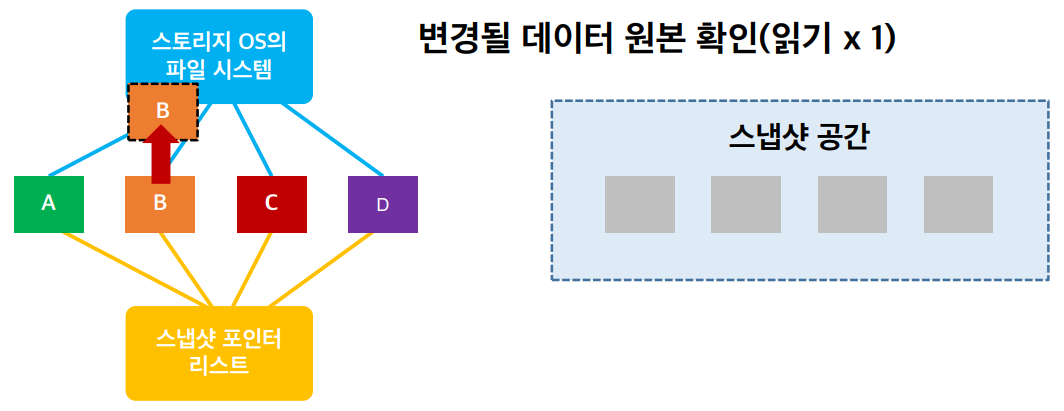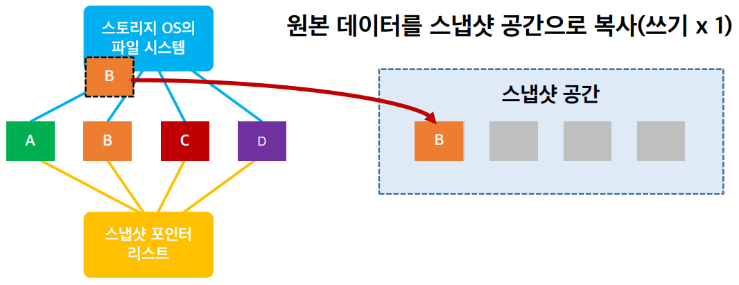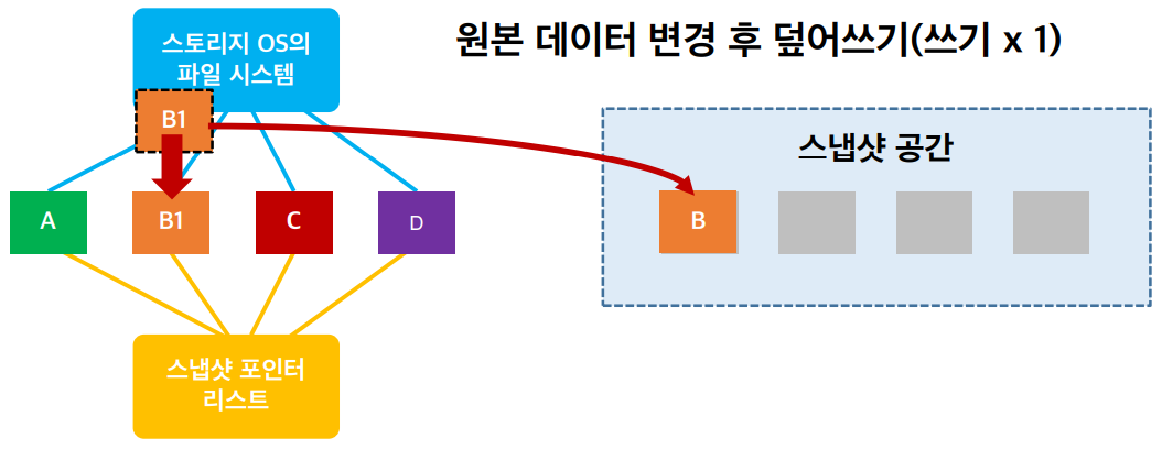 - Redirect-on-write 스냅샷: 쓰기(Write) 작업 발생 시 새로운 공간으로 쓰기 위치를 재지정(Redirect)