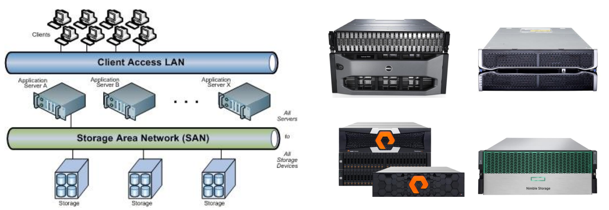 - 일반적인 이더넷 네트워크(UTP 케이블, LAN)가 아닌 FC(Fiber Channel 광케이블)을 사용해 SAN으로 연결하며, 고성능을 요구하는 시스템의 전용 스토리지로 사용