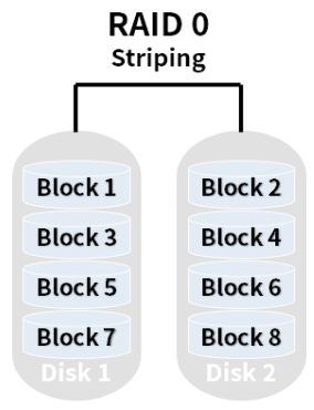 - RAID 0: 데이터를 여러 디스크에 분산 저장하여 하나의 디스크처럼 사용, 성능이 좋지만 장애 시 데이터는 모두 손실됨