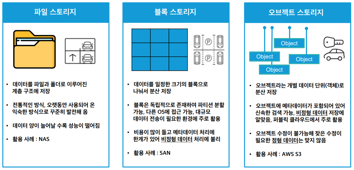 - 스토리지 유형: 파일 스토리지, 블록 스토리지, 오브젝트 스토리지
