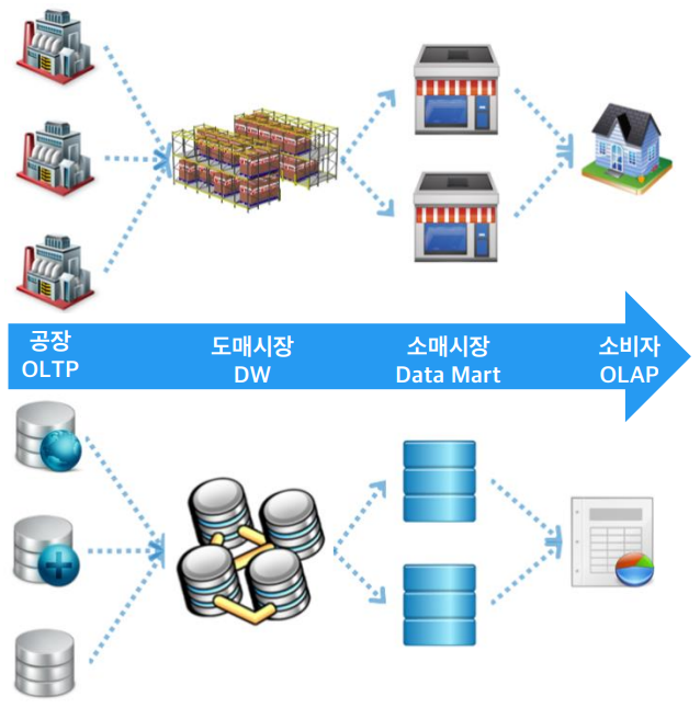 - Data Mart: 용도별로 구분하여 저장한 데이터 저장소 → 이마트, 동네 슈퍼의 식료품 코너