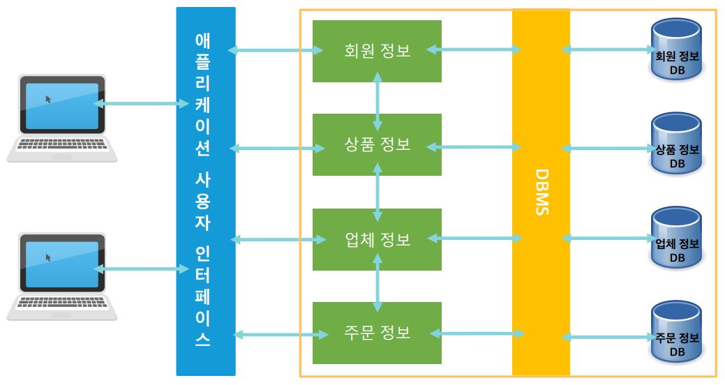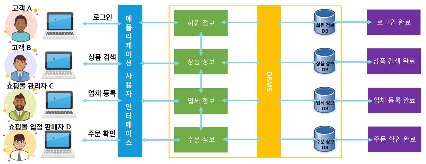 - 쇼핑몰 DBMS 예시: 쇼핑몰 이용 고객, 쇼핑몰 관리자, 쇼핑몰 입점 판매자들이 모두 DBMS를 사용