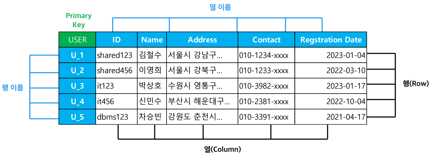 - 관계형 DBMS: Relational DBMS(RDBMS), 테이블이라는 최소 단위로 구성하면 이 테이블은 열과 행으로 이루어짐