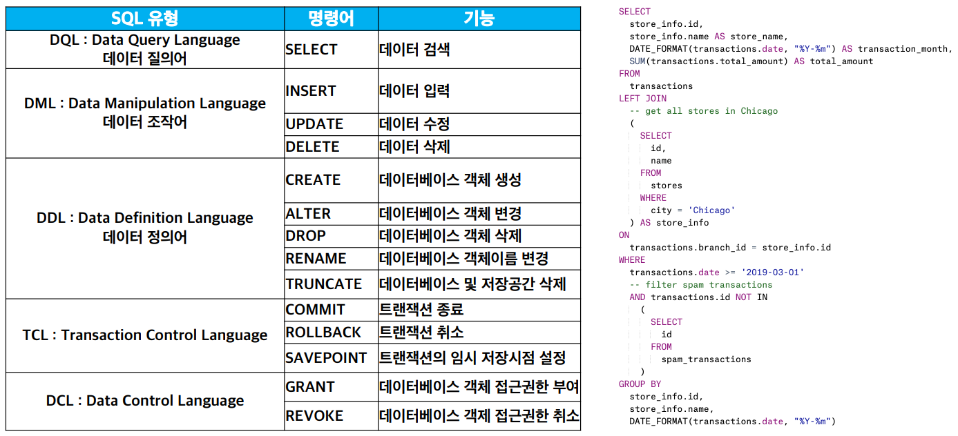 - SQL: Structured Query Language(구조적 데이터 질의 언어), 데이터베이스에서 데이터를 조회하기 위한 언어