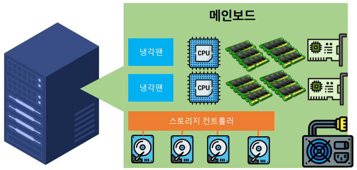 - 서버 하드웨어 구성요소: 다양한 부품이 서로 유기적으로 연결되어 있음
