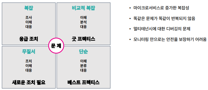 - 하지만 옵저버빌리티는 왜 잘못되었는지 알려줌, 잘못된 이유를 이해할 수 있도록 함