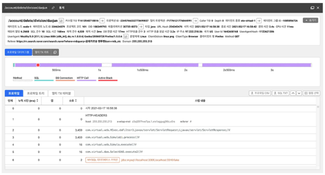 - 애플리케이션의 트랜잭션 상세보기를 통해 서버에서 처리된 시간, SQL 처리 시간, 쿼리 정보 등을 확인 가능