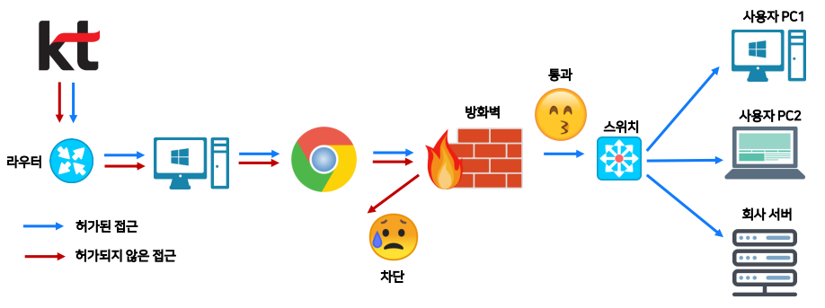 - 방화벽(Firewall): 네트워크 상의 패킷을 모니터링하고 허용되지 않은 접근은 차단하는 보안 장비