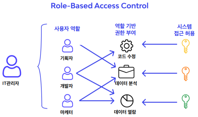 - RBAC(Role-Based Access Control): 권한이 있는 사용자들에게 한해 시스템 접속을 허용하는 접근제어 방법