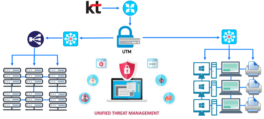 - UTM(Unified Threat Management): 방화벽, IDS/IPS, VPN, AV, 필터링 등 다양한 보안기능을 제공하는 통합위협관리 솔루션