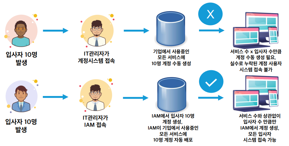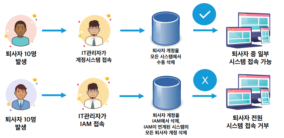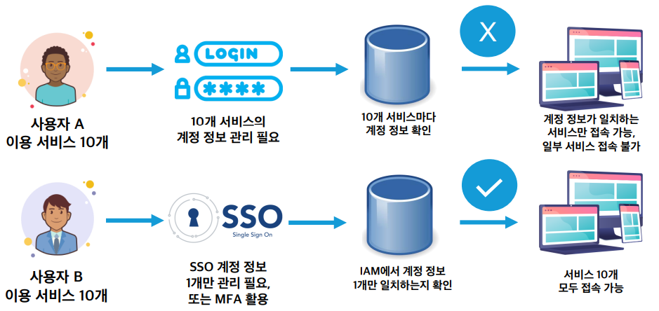 - IAM(Identity and Access Management): 기업에서 인증한 사람과 디바이스만 기업의 애플리케이션과 시스템에 접근할 수 있도록 허용하는 솔루션