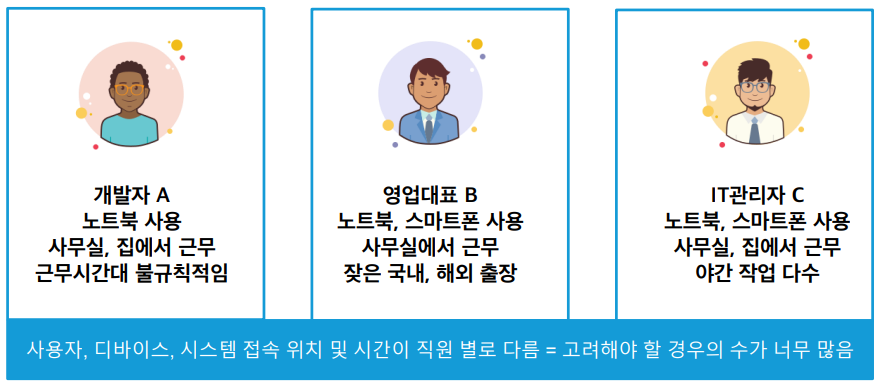 - 사용자 기기 증가, 다양한 접속 위치 및 시간대, 한번 관문을 통과하면 어떤 작업도 허용하는 전통적인 보안 방식의 한계