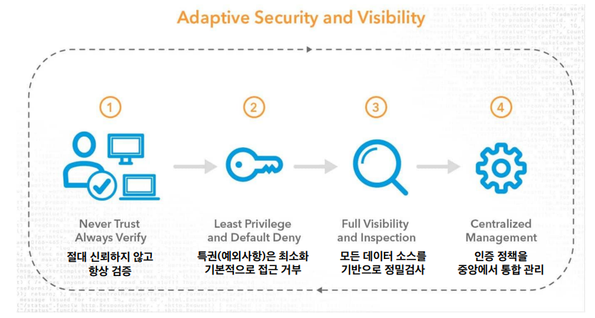 - 사용자 및 기기가 네트워크나 데이터에 접근할 때 기업에서 요구하는 보안 검증을 통과하기 전까지는 접속을 허용하지 않는 보안 아키텍처