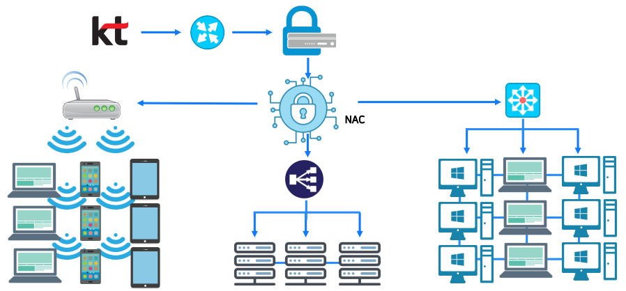 - NAC(Network Access Control): 유무선 환경에서 내부 네트워크망으로 접근하는 다양한 단말기기를 통제하기 위한 보안 솔루션