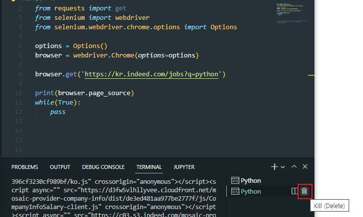 indeed.com 이 request들을 막고있기 때문에 request 부분의 코드를 모두 삭제했다.