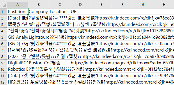 아까와 동일하게 python.csv 를 생성하면 위와 같이 Postion,Company,Location,URL 이 입력된다.
