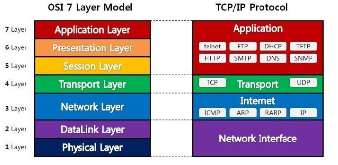- 통신이 일어나는 과정을 7단계로 정의한 국제 통신 표준 규약