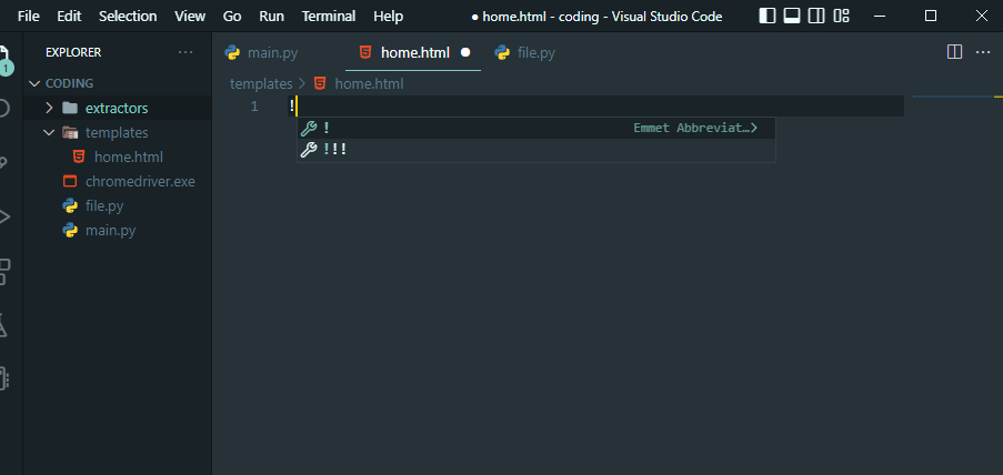 이제 home.html 에서 ! 입력 후 tab 을 누르면 html 예제 코드가 작성된다.