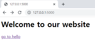 return '<h1>Welcome to our website</h1><a href=/hello>go to hello</a>'