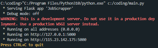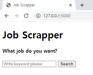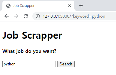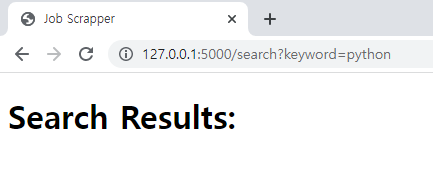 search.html 저장 후 main.py 코드를 실행하고, 크롬창을 새로 열고 주소창에 127.0.0.1:5000 입력 후 접속한다.