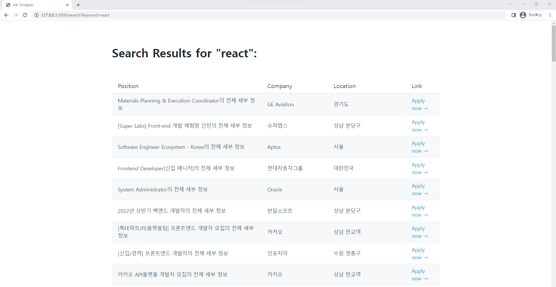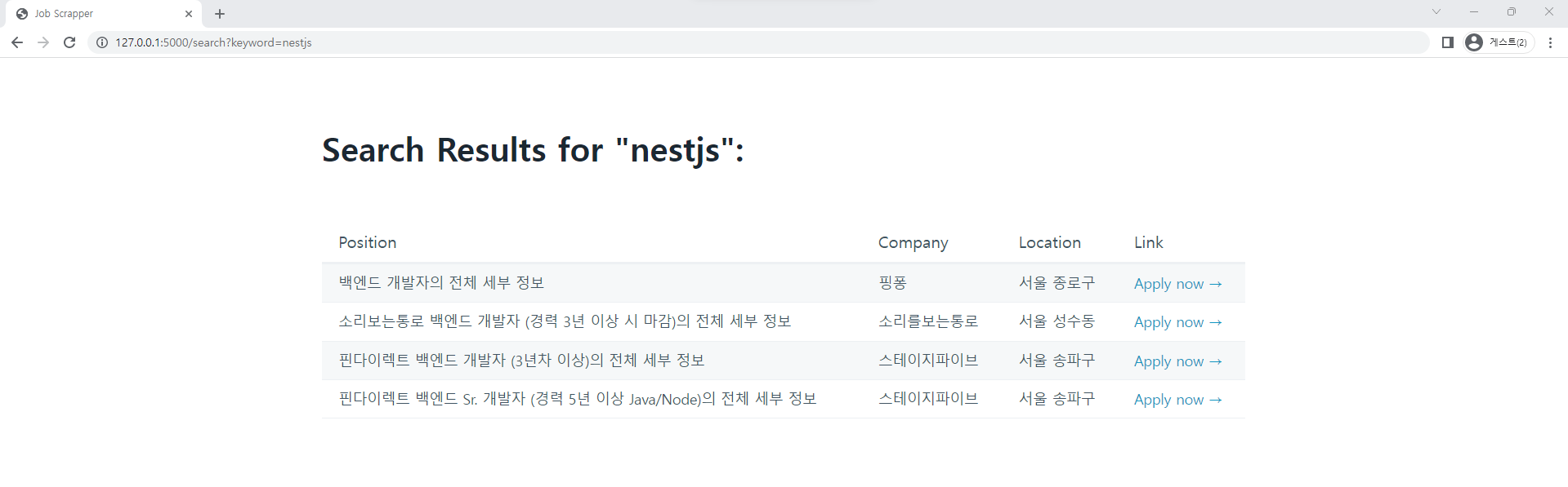 바로 이전에 스크랩 했던 검색값 ( keyword ) 에 해당하는 구인정보가 그대로 뜬다.