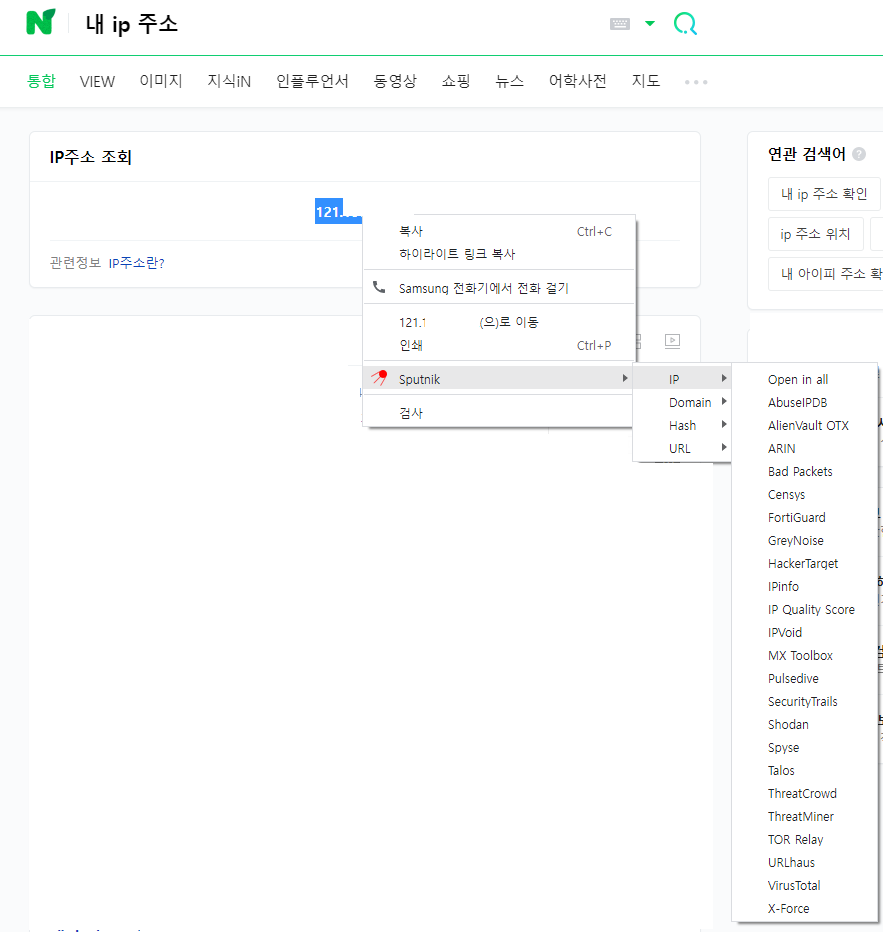 설치하고 네이버에 들어가서 내 ip 주소를 검색, 내 ip 주소를 드래그 하고 마우스 우클릭 하면 sputnik 가 보인다, 클릭해서 들어가면 다양한 OSINT 수집 사이트를 확인할 수 있는데 원하는 사이트를 클릭하면 해당 사이트로 이동하여 내 ip 주소로 검색된 검색결과를 확인할 수 있다.