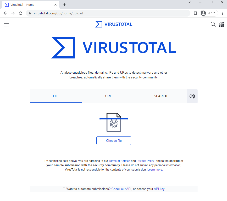 VirusTotal 은 의심스러운 파일과 URL 에 대한 악성코드 감염 여부를 분석하는 OSINT 제공 서비스이다.
