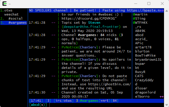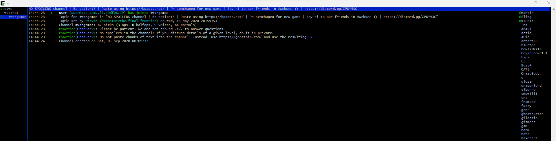 다시 weechat 에 접속하여 otws 서버를 생성하고 wargames 채널에 join 해본다.