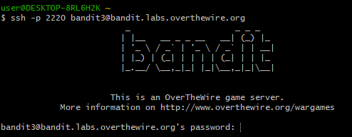 $ ssh -p 2220 bandit3@bandit.labs.overthewire.org
